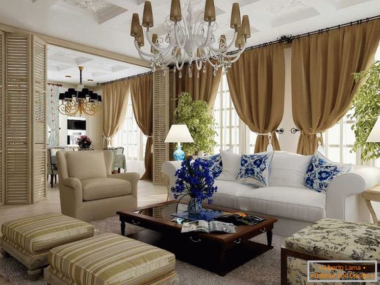 У дневној соби позадина има тамно плави узорак, подсећа на Гжелову слику. Средиште композиције биле су ватроотпорне столице и стол. Ружичасте и светло зелене боје, савршено усклађене, преовлађују у дечијој соби.