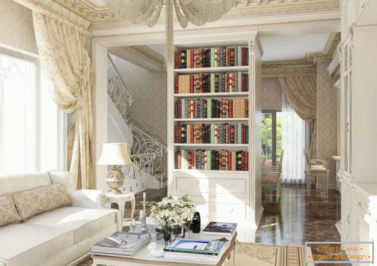 Глатка бела база је мало разблађена јаловим нијансом, што је довело посебну ноту нежности и женствености у унутрашњост. Многи комади намештаја су направљени по наруџбини, тако да се савршено уклапају у окружење.